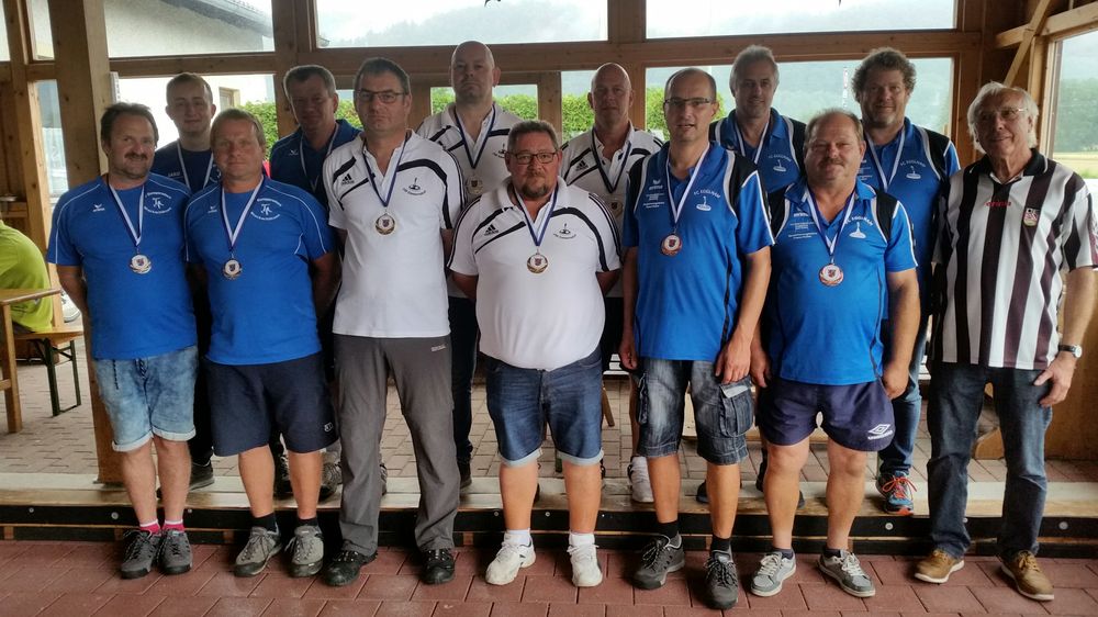 Die drei Aufsteiger in die Kreisoberliga- von links: der SV Gumpersdorf mit Martin Spielbauer, Michael Hinteraicher, Peter und Walter Empl, der FSV Emmersdorf mit Armin Voggenreiter, Josef Stadler, Herbert Drittenthaler und Christian Albrecht sowie der FC Egglham III mit Andreas Maier, Hans Jürgen Frey, Klaus Stöger und Stefan Steinbrunner sowie Schiedsrichter Rudolf Grabmeier vom DJK-SV Taubenbach.
