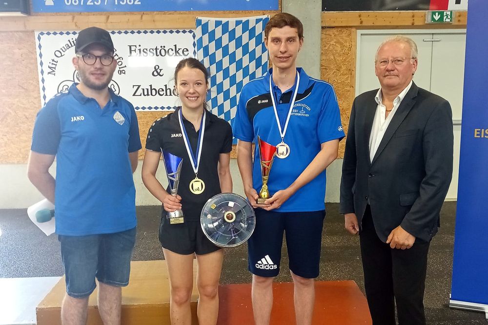 Zweimal auf dem Podest bei der Bayerischen Entscheidung in der U23: Sandra Thalbauer mit dem Titel und Mathias Hahn mit Platz drei. Mit auf dem Bild der BEV Landesjugendwart Michael Moosburger (links) und Schirmherr Bürgermeister Christian Müllinger (rechts).