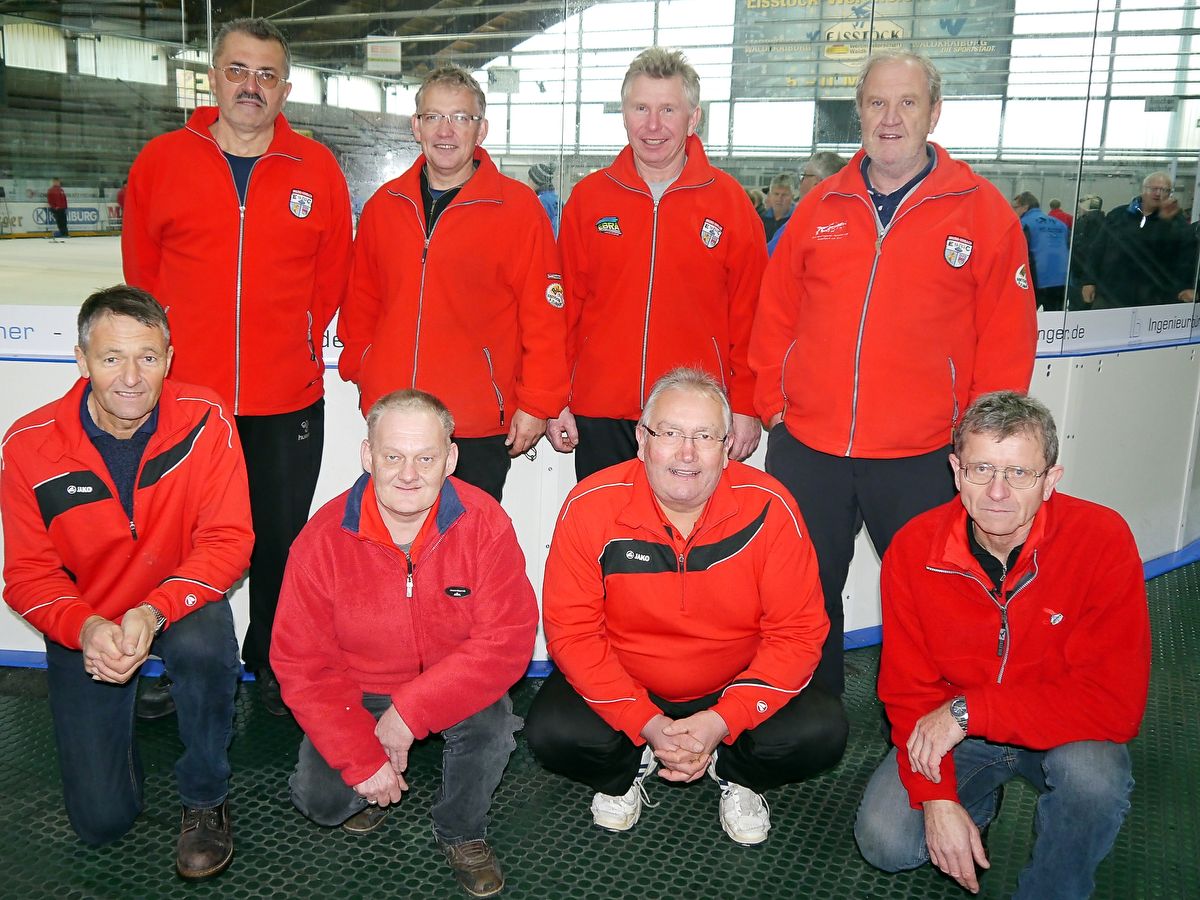 Punkgleich an der Spitze bei den Alten Herren – hinten der EC Irging Simbach mit Werner Huber, Gerhard Obermaier, Gottfried Bauer und Rudi Ostwinkl- vorne von links der SC Reicheneibach mit Franz Gruber, Leonhard Parstorfer, Wolfgang Stelzig und Heinrich Huber.